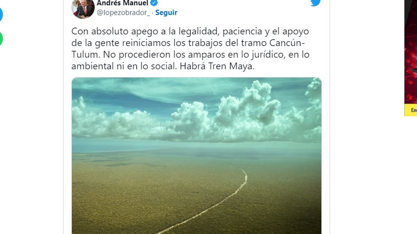 El presidente Andrés Manuel López Obrador anunció el reinicio de las obras en el Tramo 5 del Tren Maya debido a que «no procedieron los amparos en lo jurídico, en lo ambiental ni en lo social».