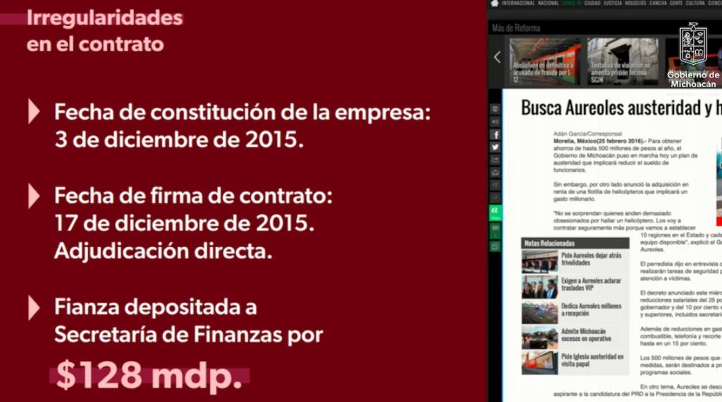Detalló que entre las irregularidades que detectaron en el contrato, que fue de adjudicación directa, es que la fecha de constitución de la empresa fue el 3 de diciembre de 2015 ante la Notaría Pública 150 del Estado de México y la fecha de la firma de contrato el 17 de diciembre del mismo año, que lo firmó Antonio Bernal Bustamante, en calidad de secretario de Seguridad Pública de Michoacán y responsable del subcomité de Adquisiciones del Sistema de Seguridad Pública y Procuración de Justicia, por parte de la empresa lo hizo, Ismael Flores Ramos.