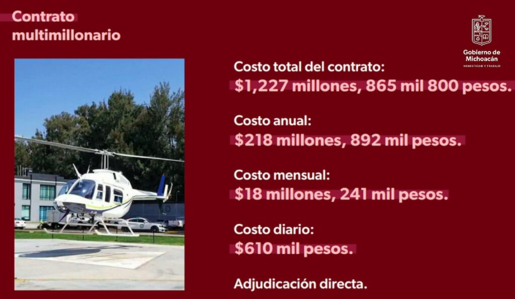 Durante la administración estatal del exgobernador, Silvano Aureoles Conejo, se tuvo un gasto de renta de aeronaves por 1, 227 millones 865 mil 800 pesos, por 69 meses de 2016 a agosto de 2021, expusieron el secretario de Seguridad Pública, José Alfredo Ortega Reyes y el secretario de Gobierno, Carlos Torres Piña.