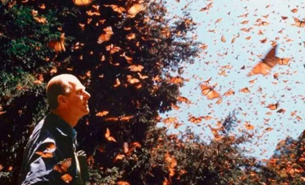 Sin embargo llamó la atención que, durante el discurso, una fotografía al lado suyo evocaba la memoria del ex duque, su pareja de toda la vida: con la mirada al cielo y asombro en su rostro, se observa al príncipe apreciando a las miles de mariposas monarcas que volaban a su alrededor en uno de los santuarios más importantes de la especie, ubicado en Michoacán, México.