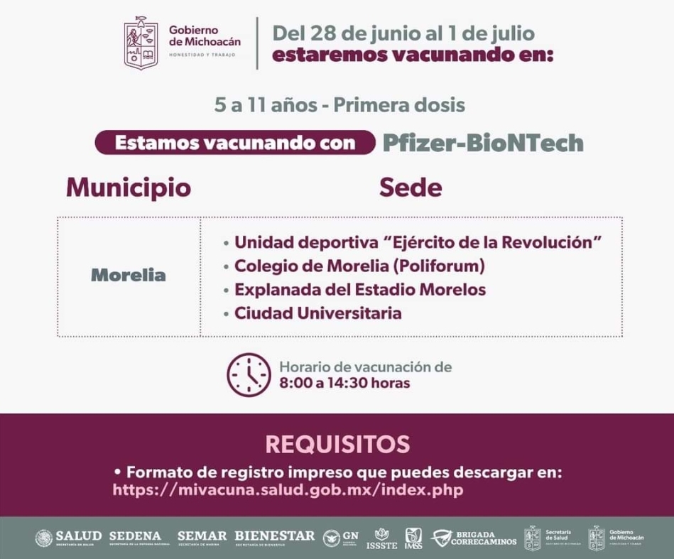 Inicia en Morelia el próximo martes 28 de junio la vacunación para niños de 5 a 11 años.