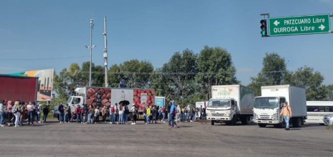 Esta presencia se mantendrá por varias horas, y se suma a la que ya realizan agremiados al Frente Estatal de Sindicatos de Educación Media Superior y Superior (FESEMSS), con bloqueo en la salida a Pátzcuaro.