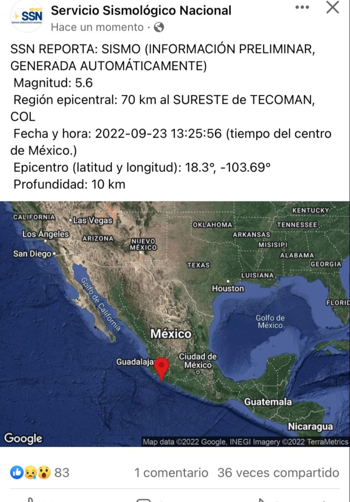 De manera preliminar, el Servicio Sismológico Nacional (SSN) informó que el epicentro fue 70 kilómetros al sureste de Tecomán, y que tuvo lugar a las 13:25 tiempo del centro de México.