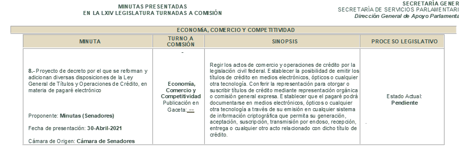 Tan es real lo expuesto, que, por ejemplo, que el senado ya contempla la posibilidad del pagaré electrónico, esto no podría acontecer, sin previo estar reconocida «la firma electrónica», esto sucedió en el acuerdo que se tuvo en la sesión del 28 de Abril del 2021, donde la Mesa Directiva de la H. Cámara de Senadores mediante oficio No. DGPL-1P3A.-4153 turnó la mencionada Iniciativa a las Comisiones Unidas de Hacienda y Crédito Público y de Estudios Legislativos, para su análisis y dictamen correspondiente.
