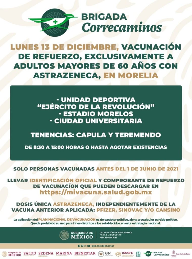 Para continuar con la jornada de refuerzo contra el COVID-19 a adultos mayores, se habilitarán 5 sedes en la capital michoacana.