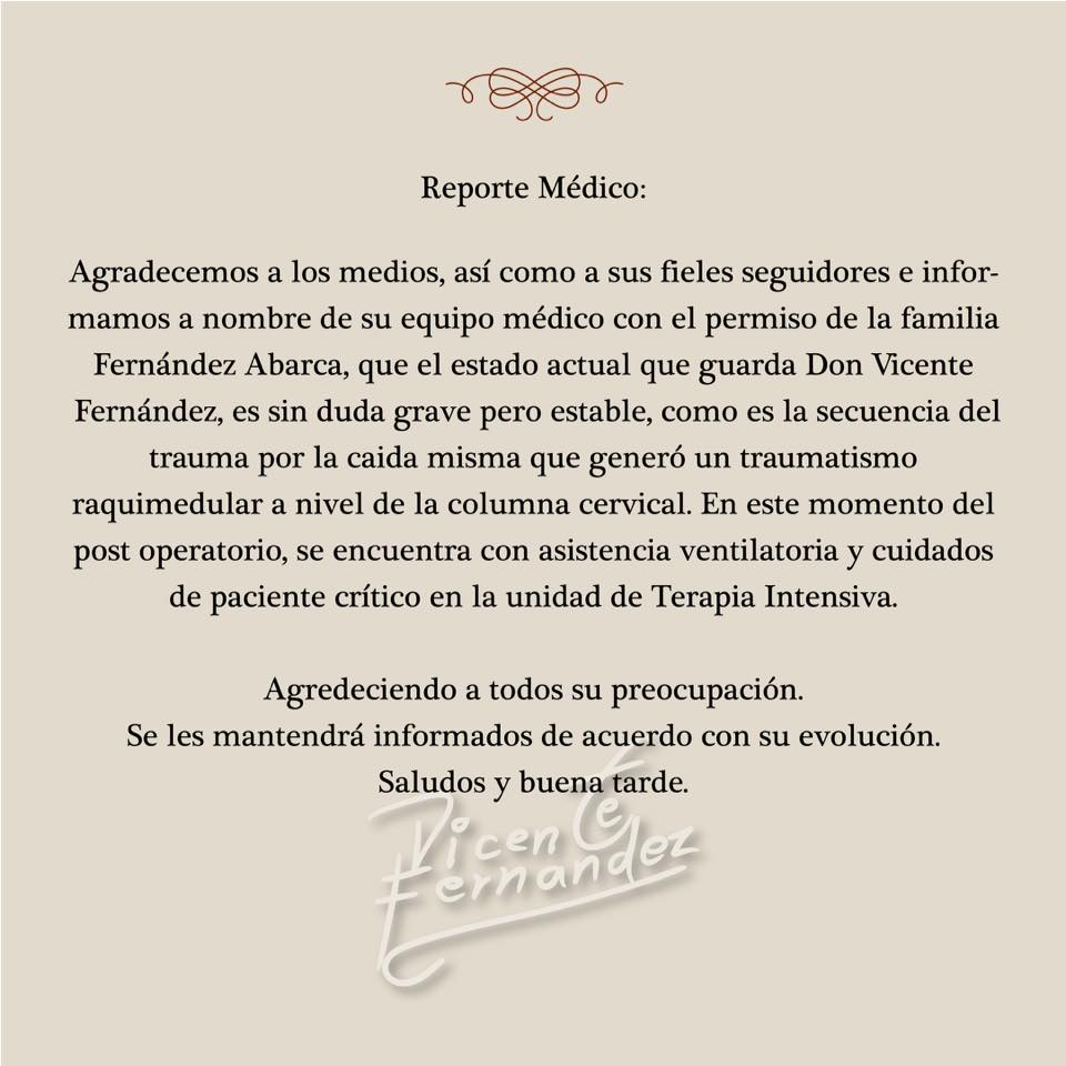 Y durante las últimas horas, Los Fernández dieron a conocer el nuevo parte médico del “Charro de Huentitán”, quien aún se encuentra bajo el cuidado de sus médicos de cabecera, e incluye “un grave, pero estable”.